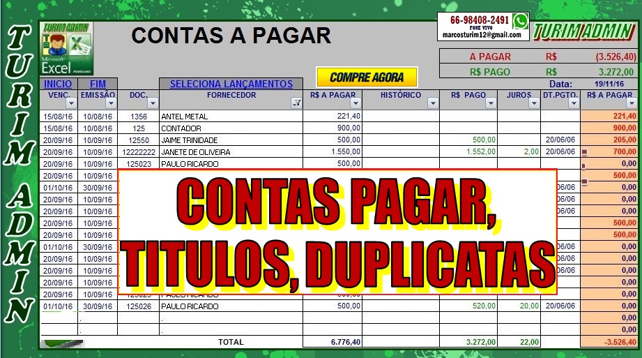 PLANILHAS DE CONTAS A PAGAR DE FORNECEDORES, DUPLICATAS, EMPRESAS E LANÇAMENTO DE TÍTULOS A VENCER. Valor R$ 50,00