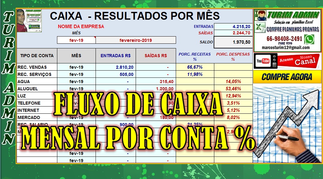 PLANILHA MOVIMENTO DE CAIXA RESULTADOS MENSAIS POR TIPO DE CONTAS E PORCENTAGEM R$ 70,00
