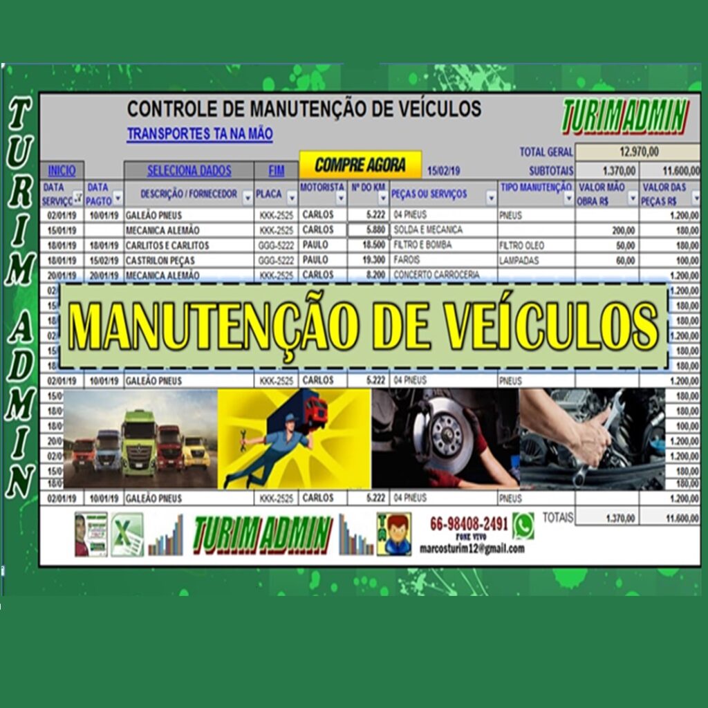 PLANILHA DE CONTROLE DE MANUTENÇÃO DE VEÍCULOS OU CAMINHÕES E TOTAIS DE DESPESAS R$ 50,00 – TURIM ADMIN – To no Zap 66-98408-2491.