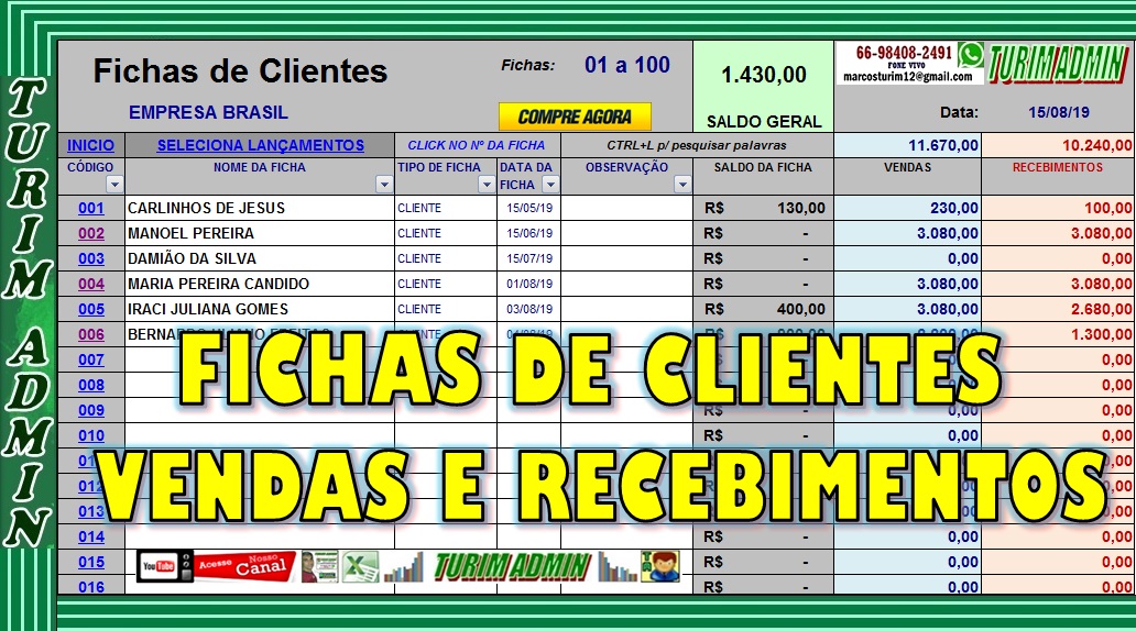 Planilha para fichário de clientes, para lançar as vendas, recebimentos e ver os saldos individual e geral, por clientes.